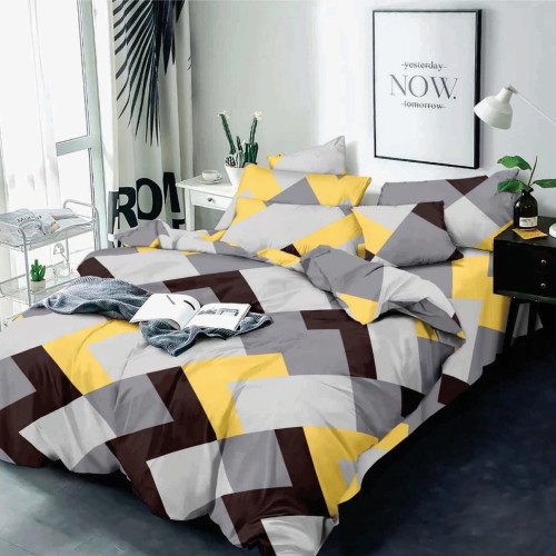 A gray and yellow abstract pattern can create an impression of modernity and freshness in your bedroom.